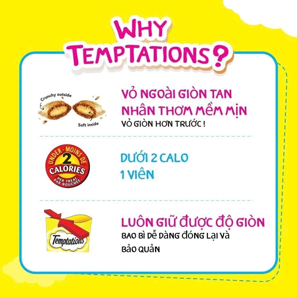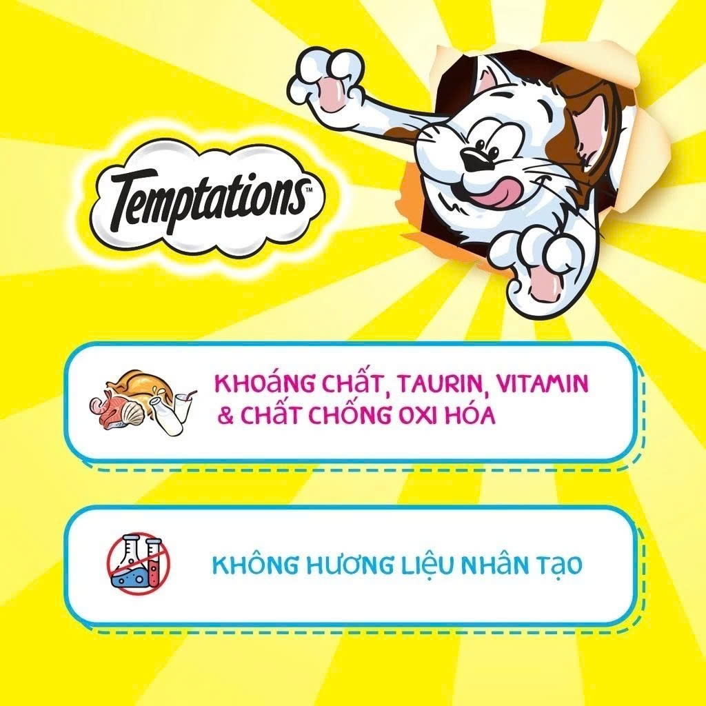 • Vỏ ngoài giòn tan, nhân thơm mềm mịn: Bánh thưởng cho mèo Temtaions được chế biến cẩn thận với sự kết hợp thú vị, vỏ ngoài giòn khiến mèo thích thú khi nhai, nhân bên trong mềm mịn và thơm ngon, khiến mèo không thể cưỡng lại và ăn nhiều hơn.