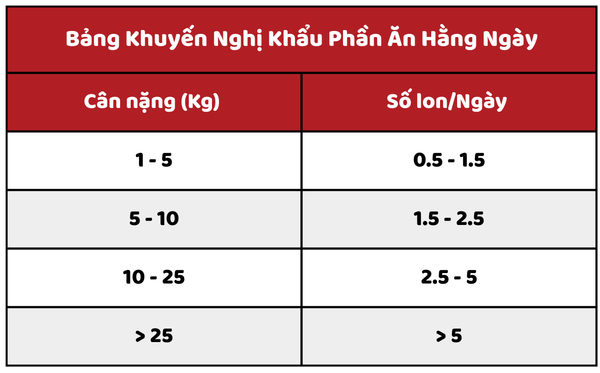 Khẩu phần ăn hàng ngày có thể được điều chỉnh tùy theo kích thước, cân nặng, độ tuổi và mức độ vận động của chó. Bảo quản thức ăn ở nhiệt độ phòng. Luôn cung cấp nước cho chó thường xuyên.