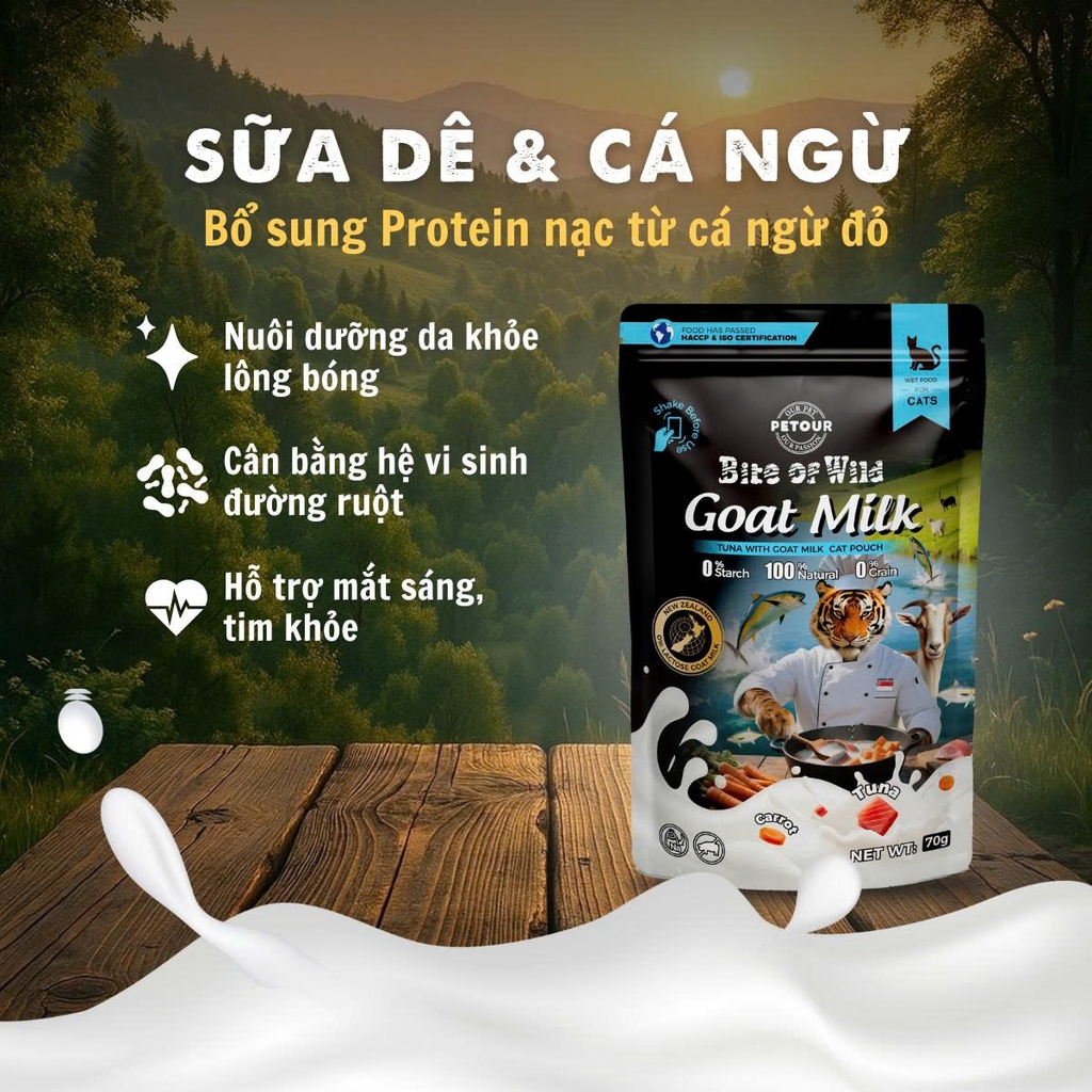 + Goat milk - Tuna: Cá ngừ 50%: protein ít béo, hỗ trợ phát triển cơ bắp, bổ sung Omega-3 chăm sóc da và lông bóng mượt.