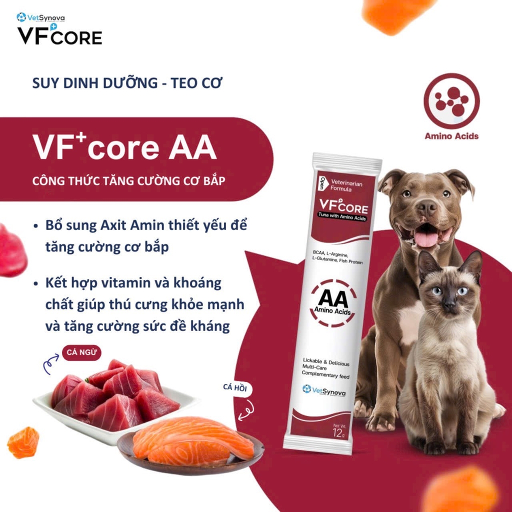 VF+Core JC - Thực phẩm chức năng dạng súp thưởng bổ máu cho cả chó và mèo Dạng: Kem Quy cách đóng gói: Gói 12g Đối tượng sử dụng: Chó , Mèo Nhóm công dụng: Thực phẩm chức năng